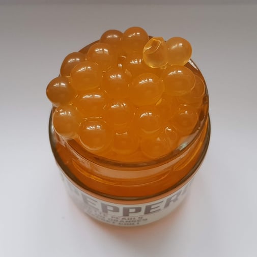 De buitenkant van de PEPPERO PEARLS is gemaakt van agar-agar (zeewier), wat de parels ook geschikt maakt voor vegetariërs en veganisten.